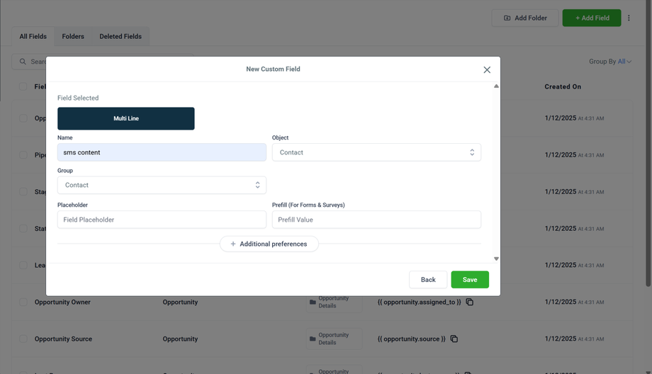sms_content - map to sms from custom values