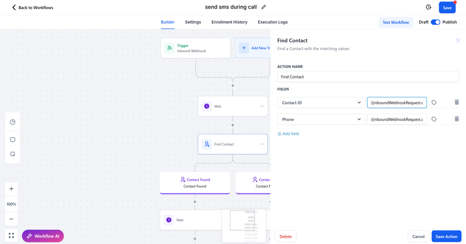 Contact IDandPhonefrom the webhook payload and map them to Inbound webhook trigger - Call - Call id, - and map the same fields for phone- Inbound webhook trigger - Call - From_number