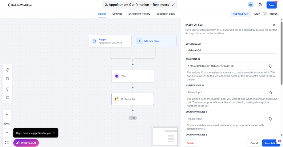 Example: “Hi {{contact.name}}, this is a reminder about your appointment today at {{appointment.time}}.”