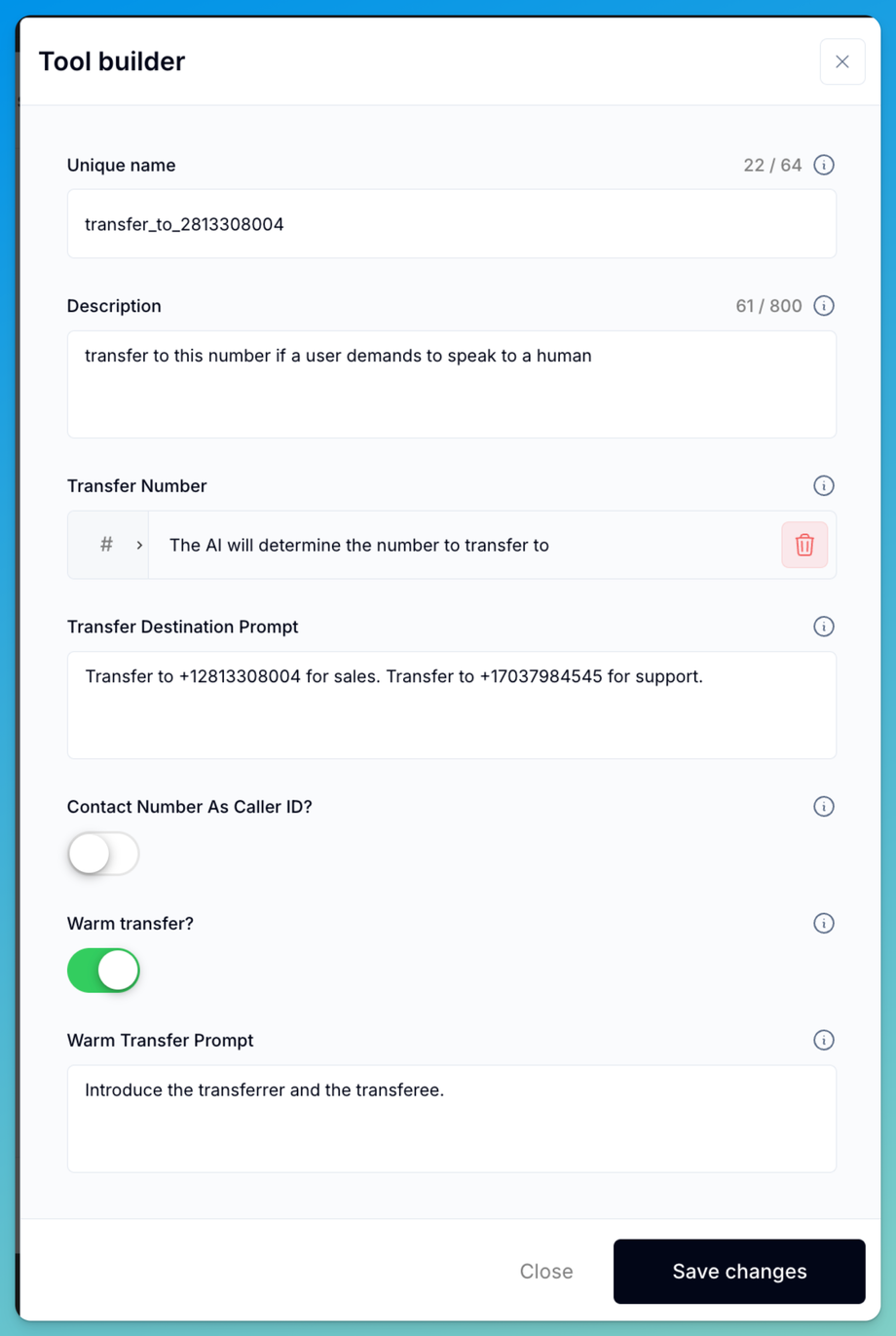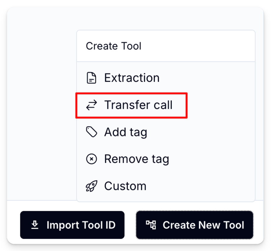 In order to get your AI Assistant to transfer a phone call, you must first create a custom tool which instructs your AI Assistant where to transfer the call to and under which conditions. Then once you create the tool, you must add the tool to your assistant.
